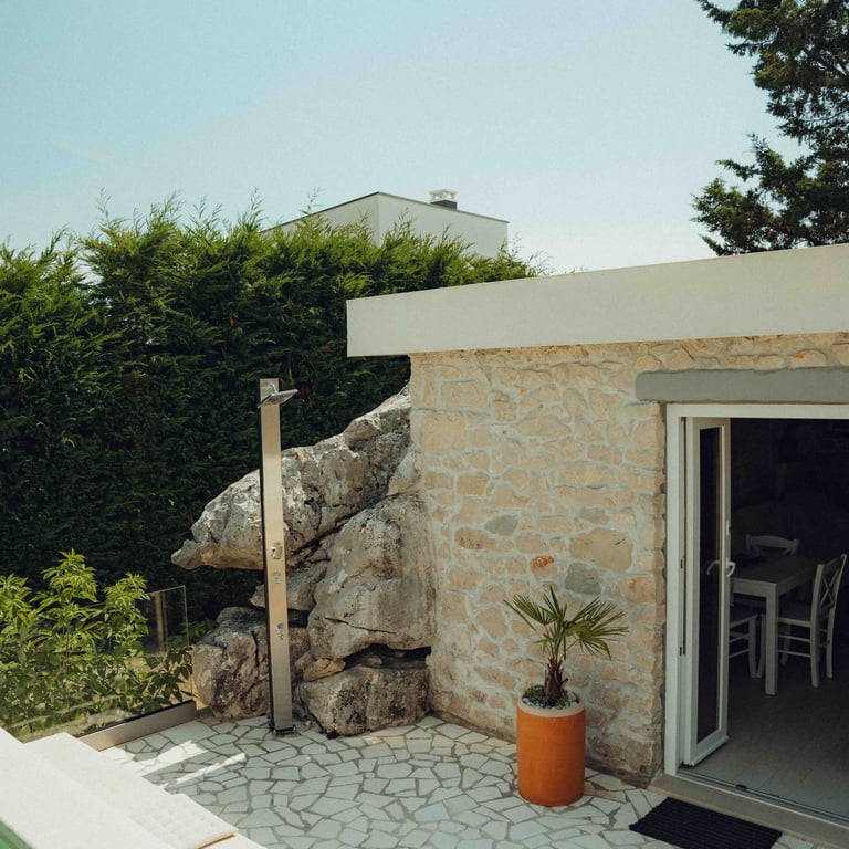 In der schön gestalteten Konoba, die besonders attraktiv ist, da sie teilweise auf natürlichem Felsen erbaut wurde, befindet sich eine weitere komplett ausgestattete Küche mit Esstisch und Eckgarnitur sowie ein separates WC.